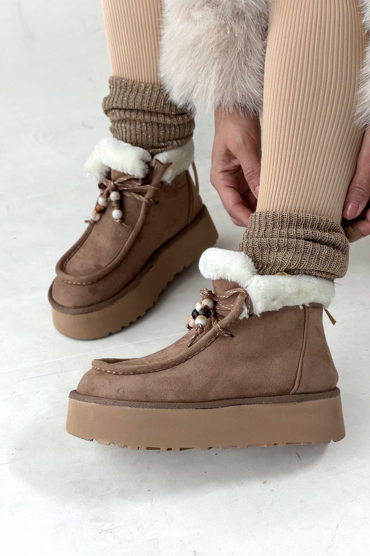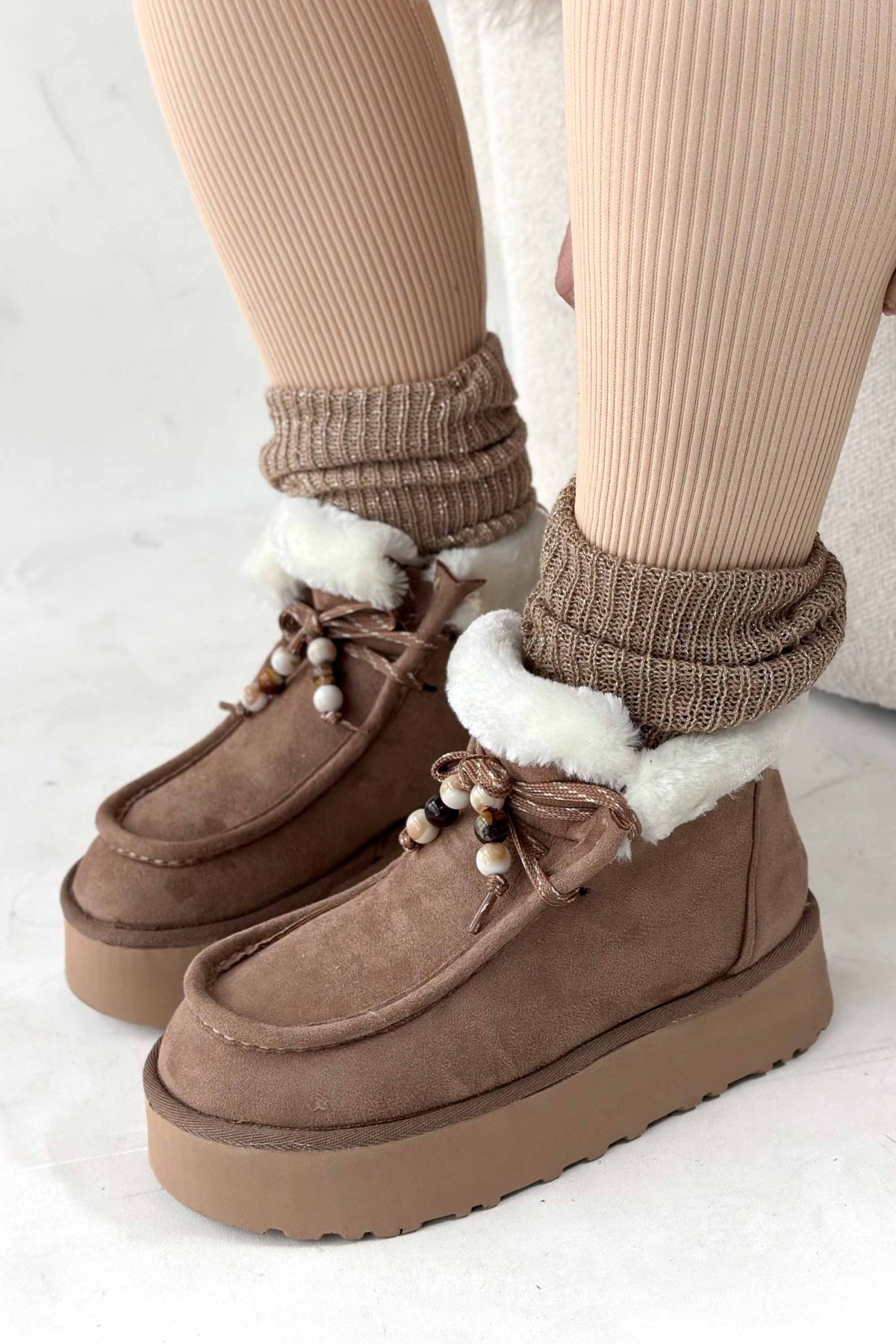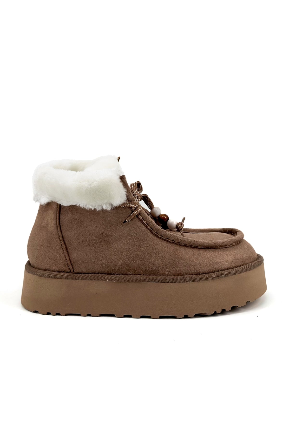 Juno Taş Rengi Kürk Detay Boncuk Bağcıklı Kadın Bot