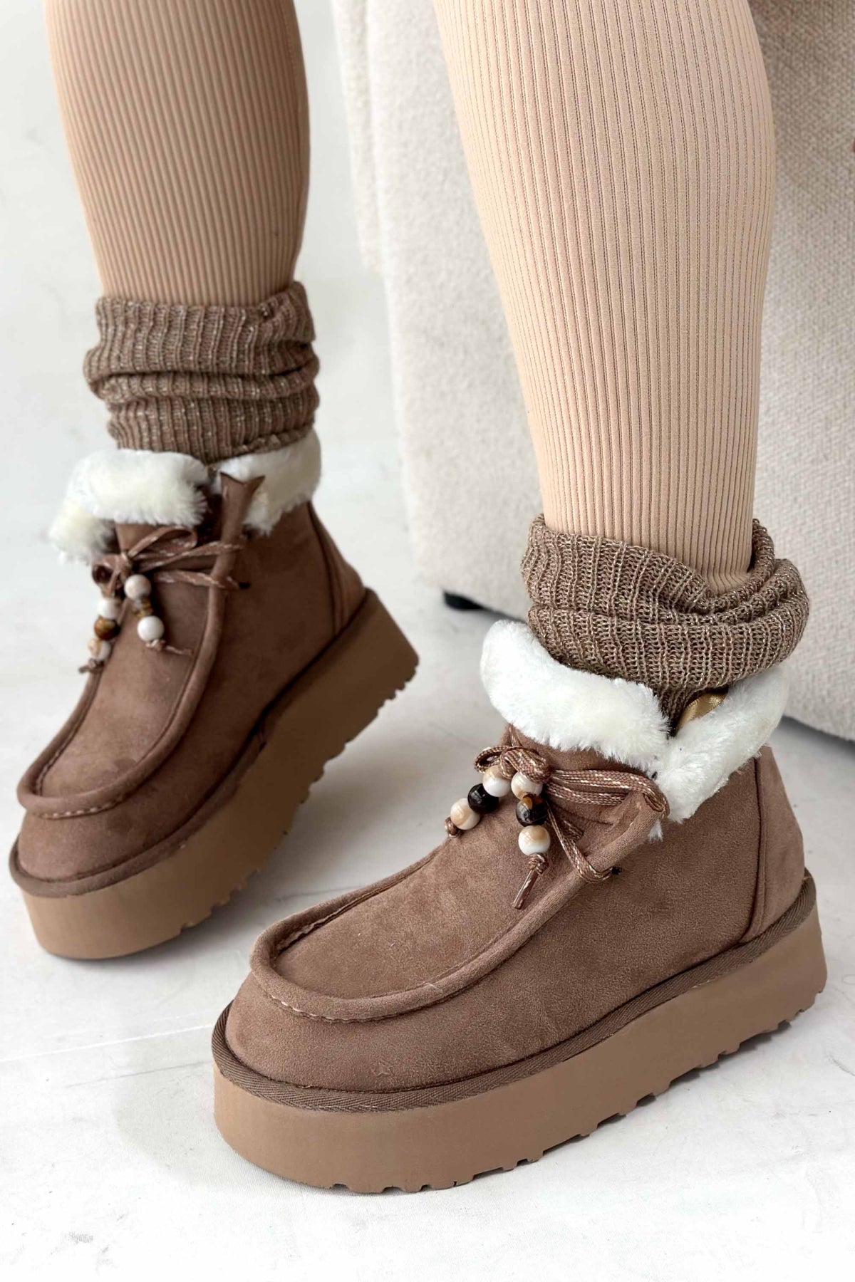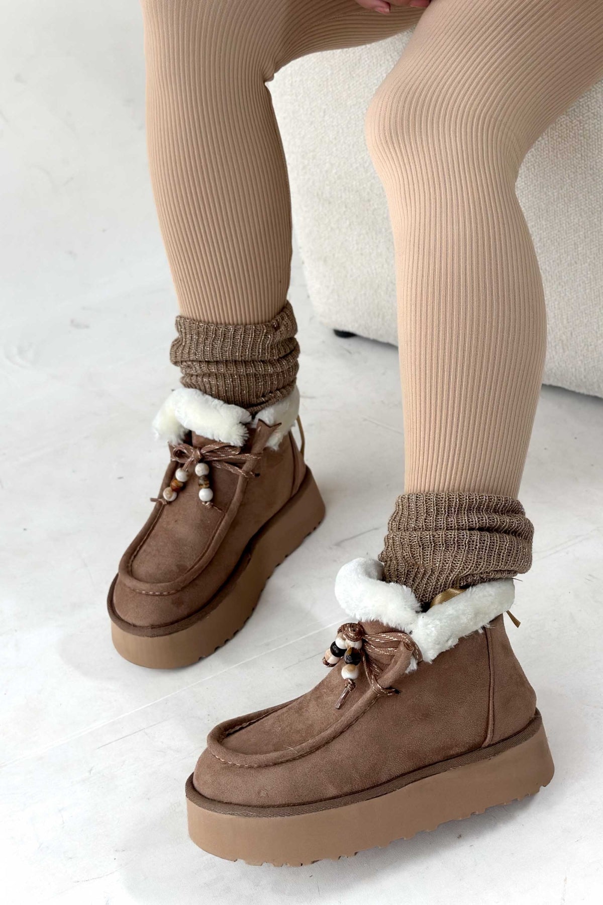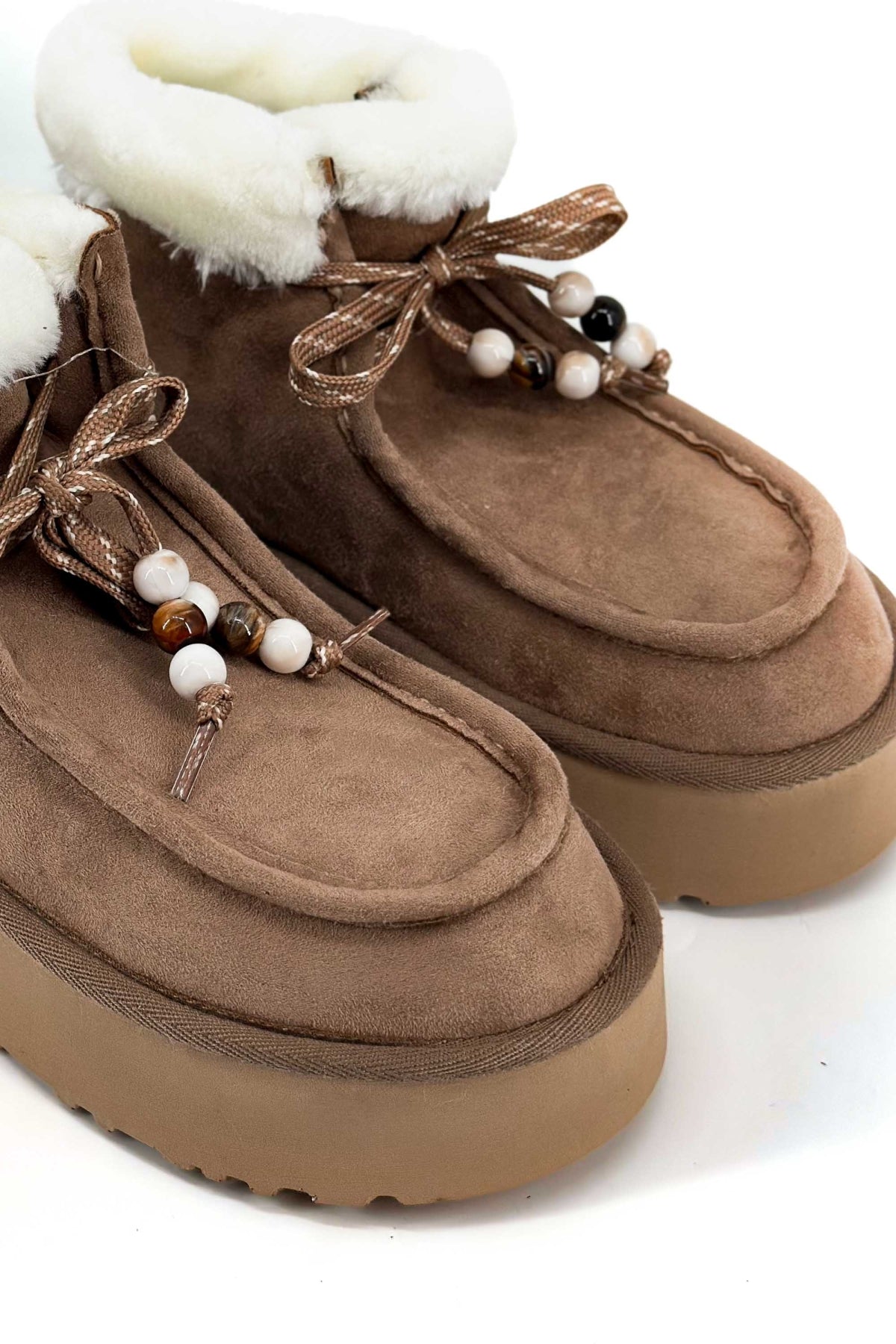 Juno Taş Rengi Kürk Detay Boncuk Bağcıklı Kadın Bot