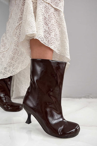 Cenny Acı Kahve Çatlak Rugan Yuvarlak Burun Geniş Kesim Kadın Bootie