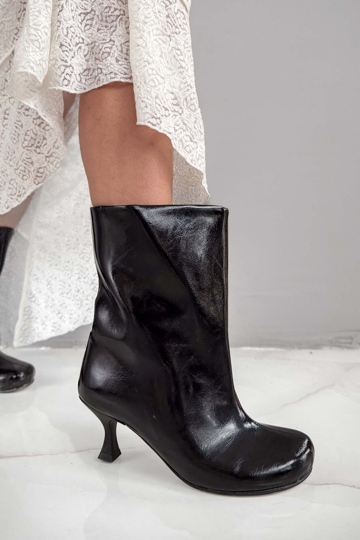 Cenny Siyah Çatlak Rugan Yuvarlak Burun Geniş Kesim Kadın Bootie