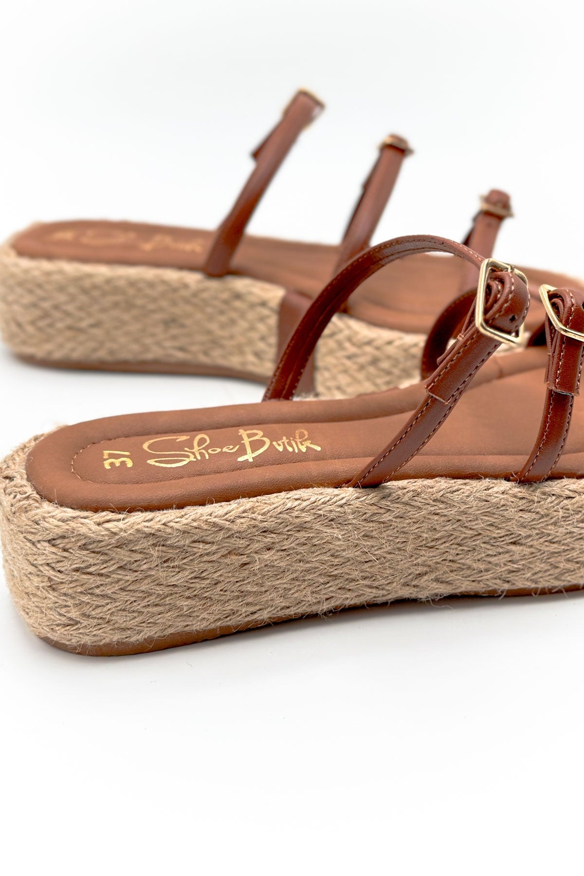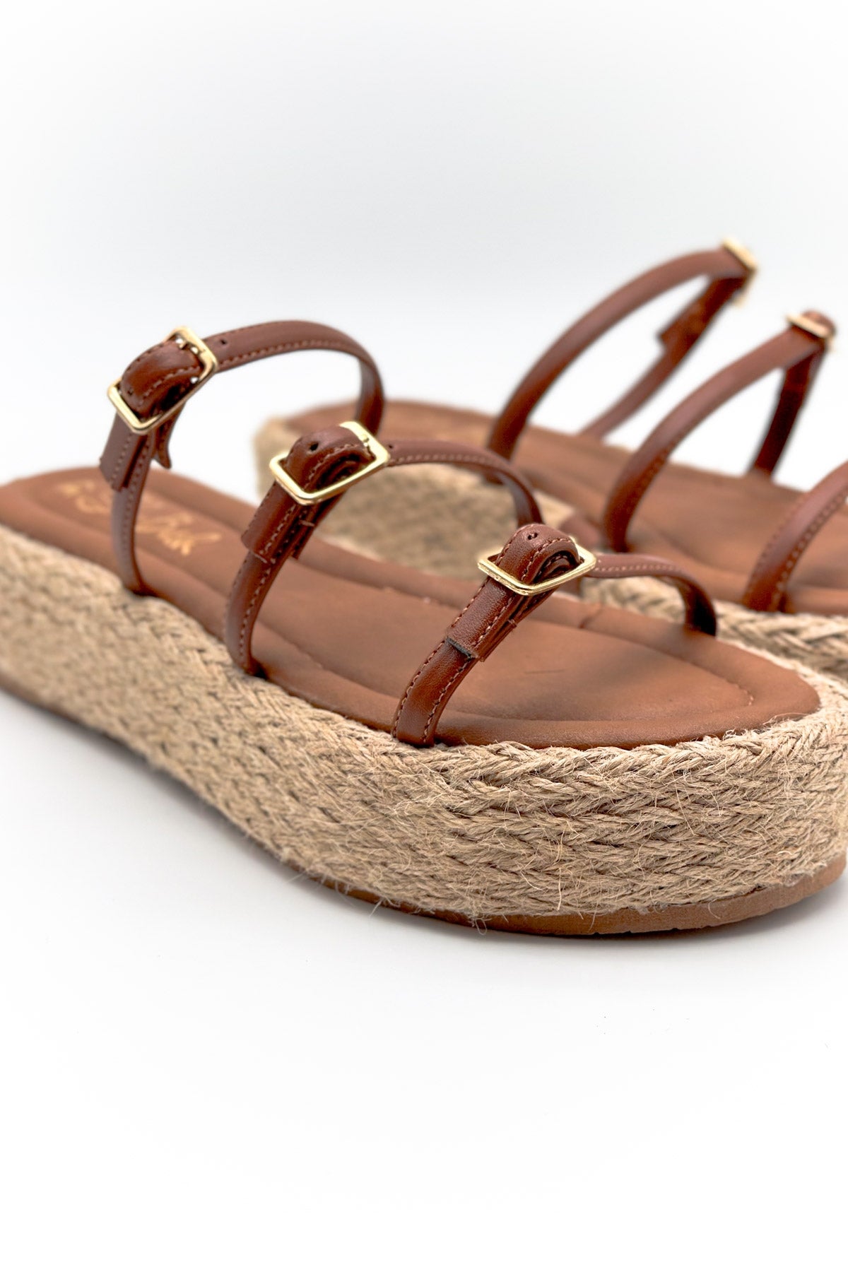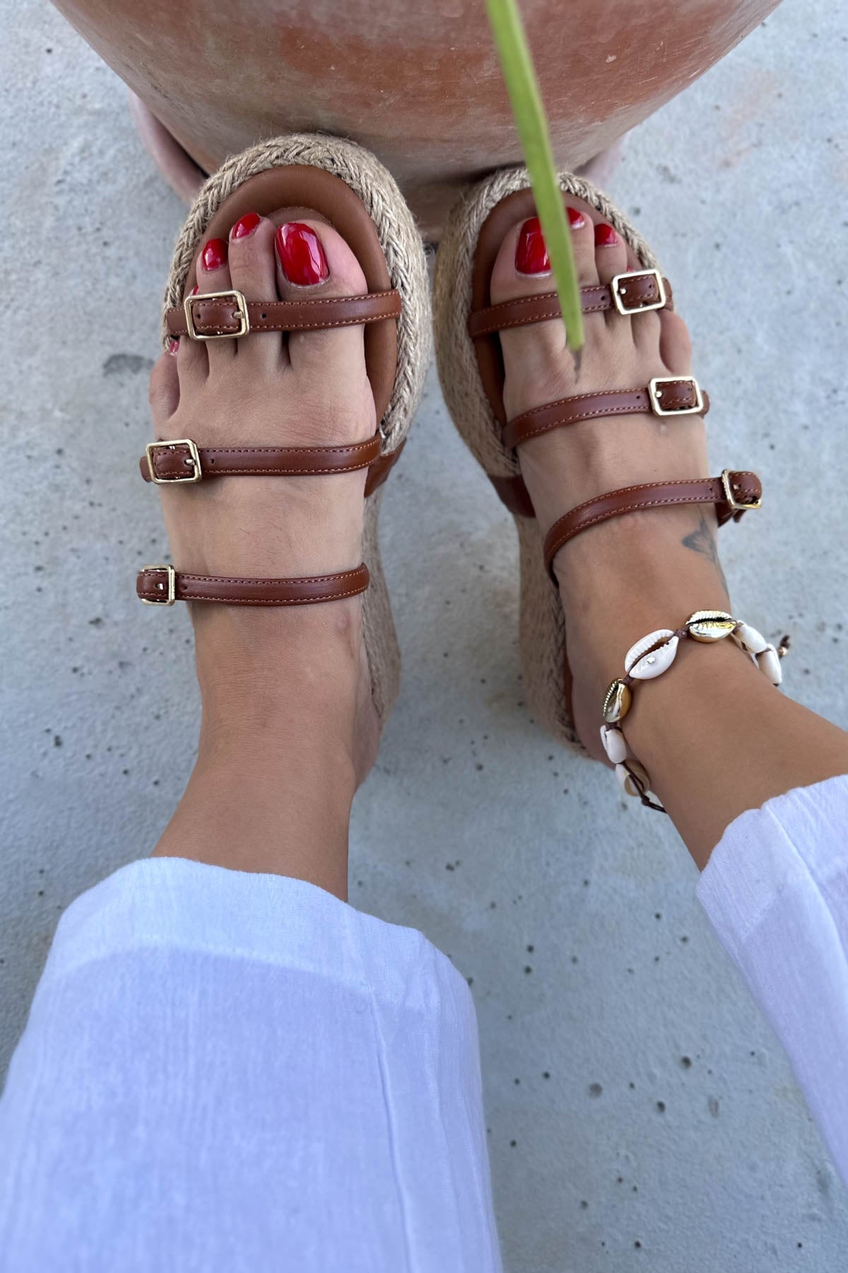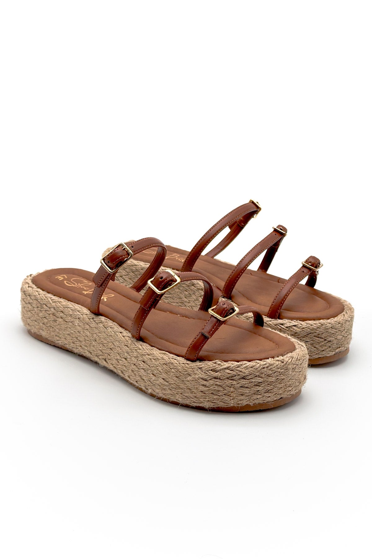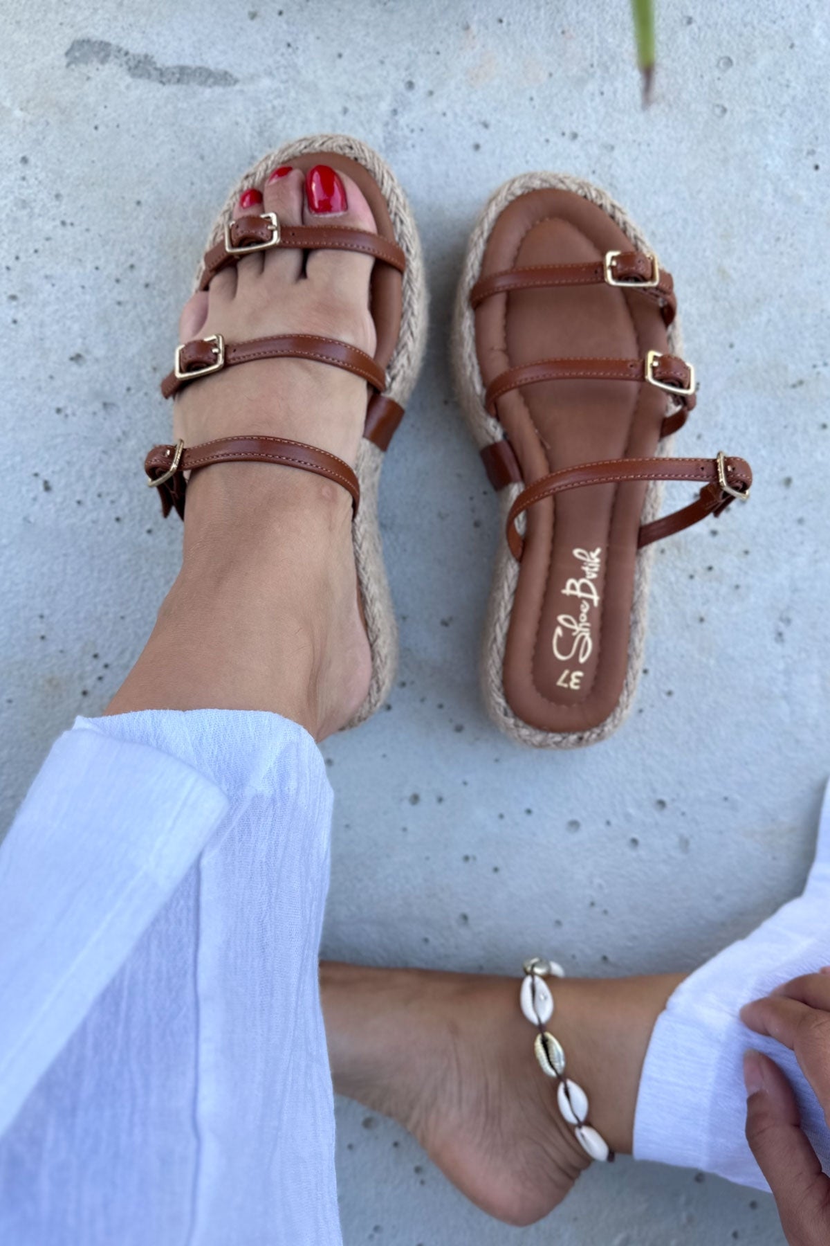 Elanor Taba Deri İnce Bantlı Hasır Topuklu Kadın Terlik