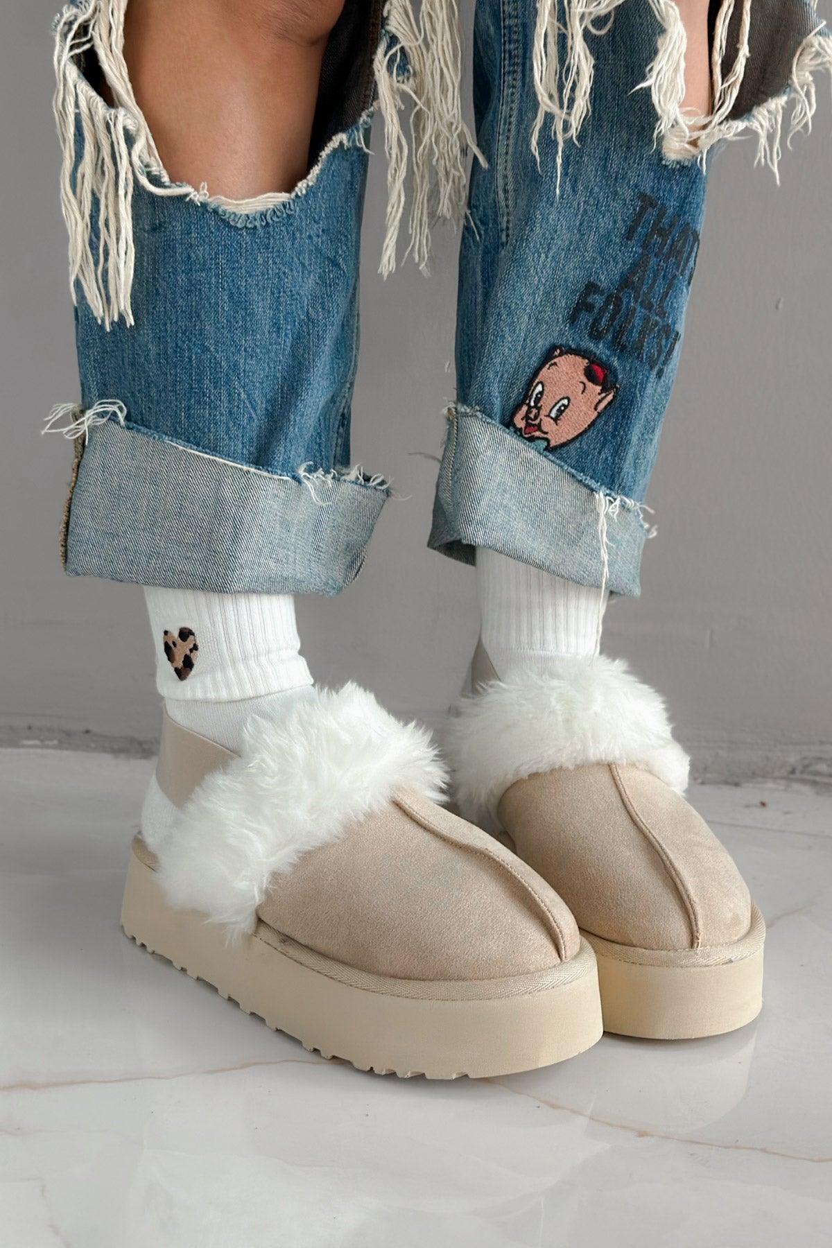 Yoğun peluş kaplaması sayesinde ayaklarınızı soğuktan korurken, modern tasarımıyla sade ama göz alıcı bir görünüm oluşturur. Günlük kullanıma uygun yapısı, rahatlık ve stil arayanlar için mükemmel bir tercihtir.