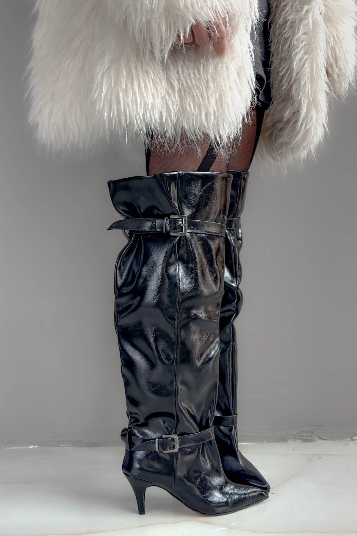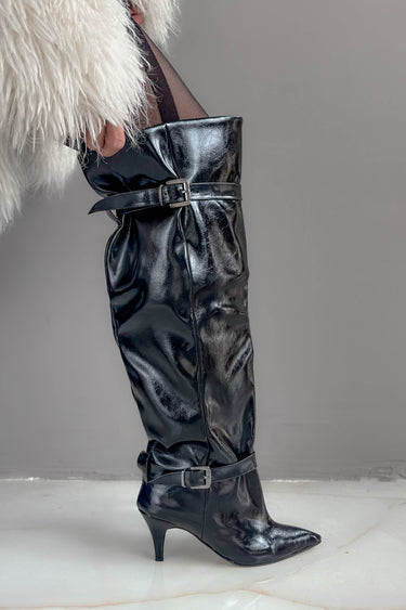 Brondby Siyah Çatlak Rugan Toka Detay Bol Kesim Kadın Çizme