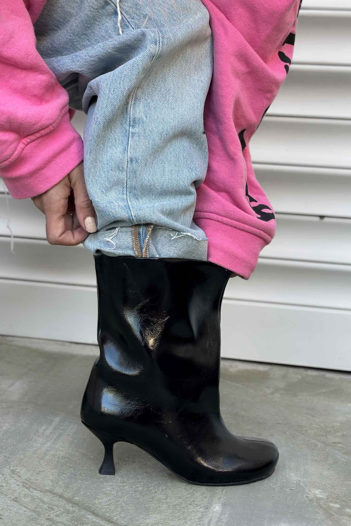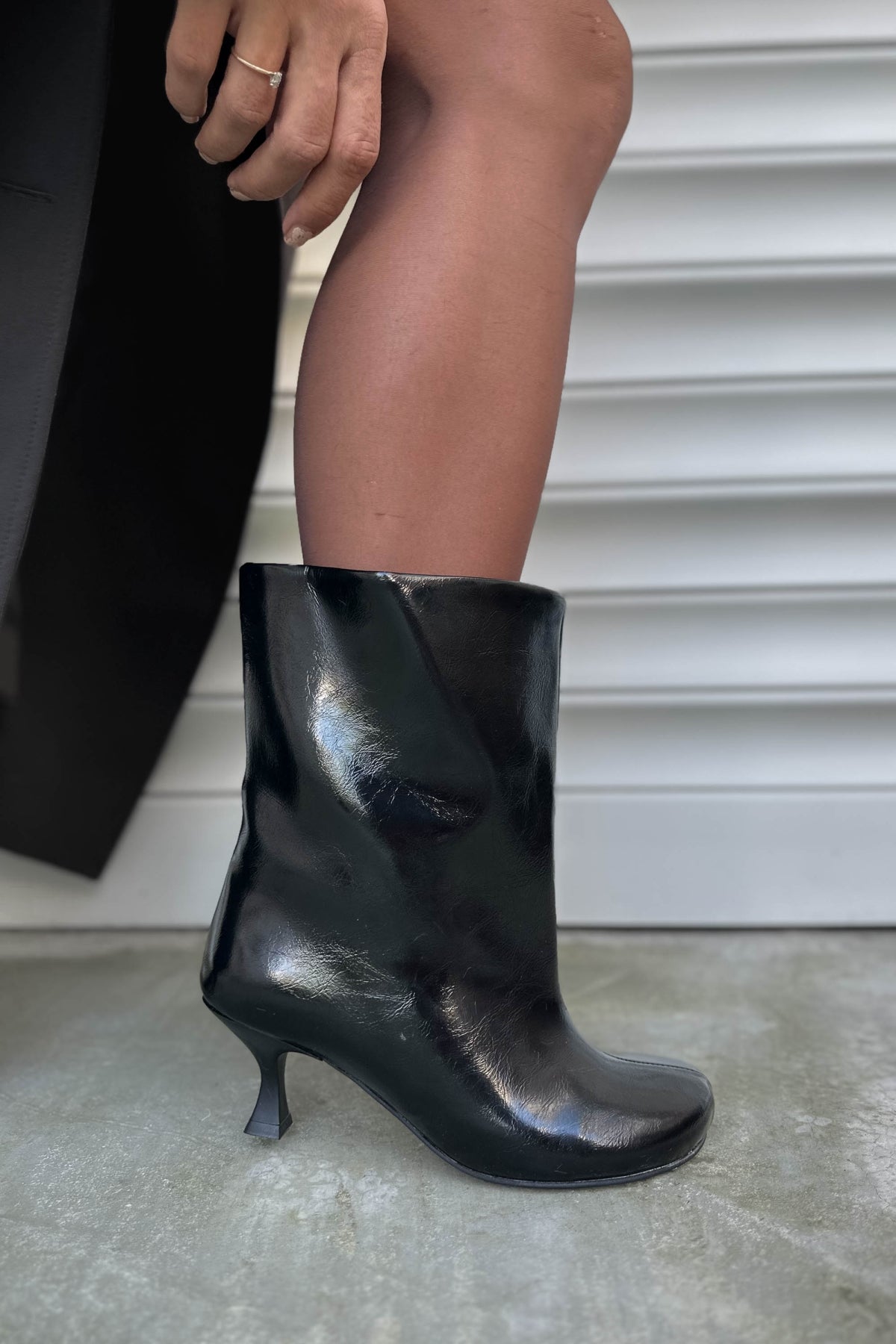 Cenny Siyah Çatlak Rugan Yuvarlak Burun Geniş Kesim Kadın Bootie
