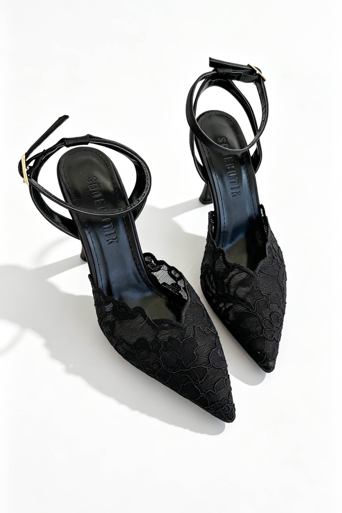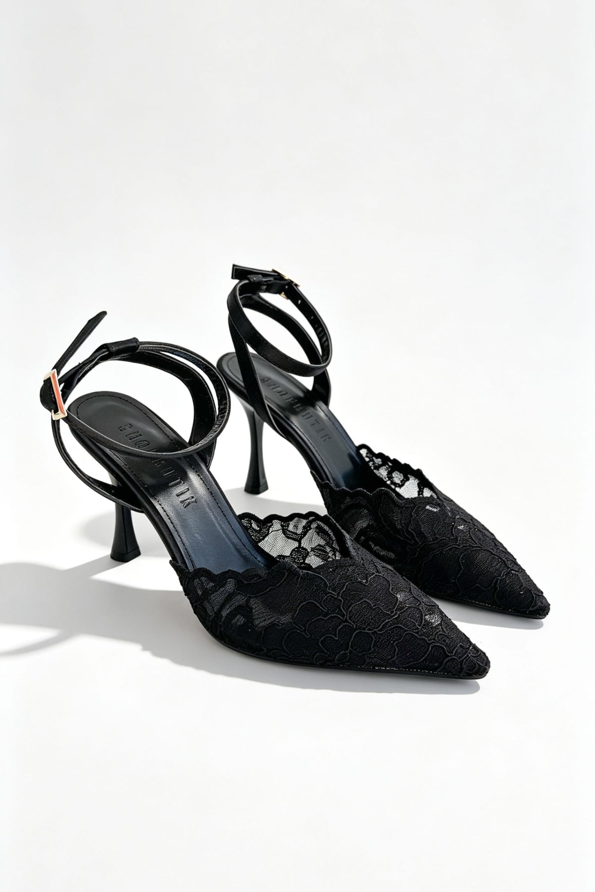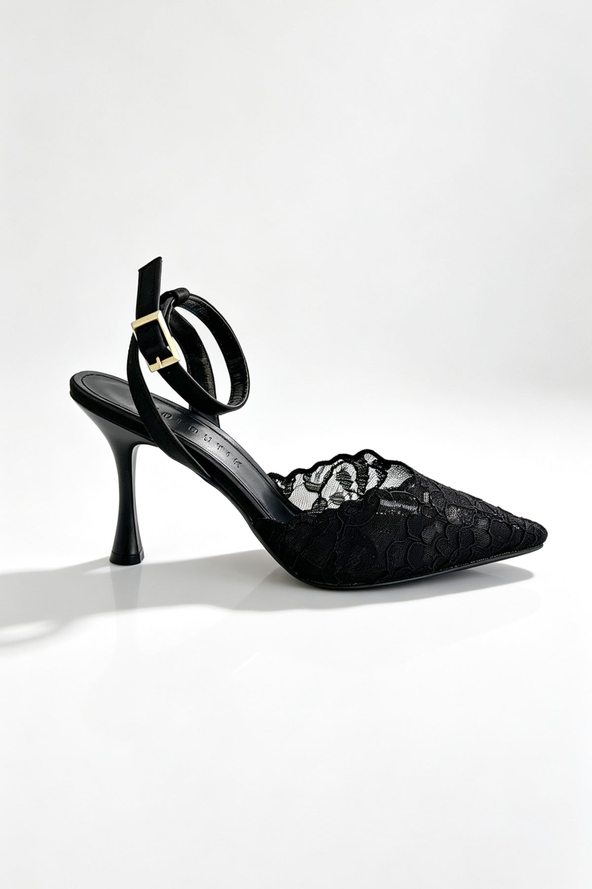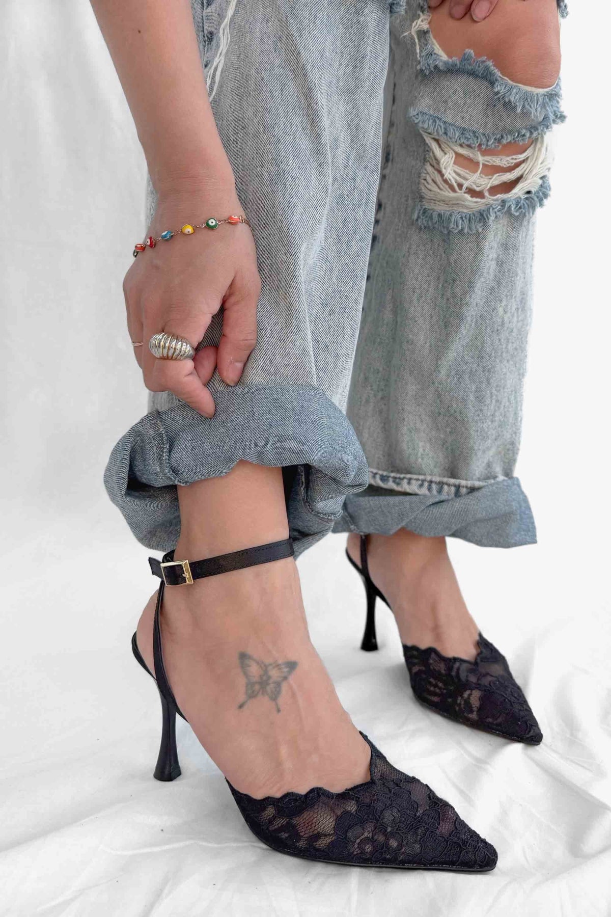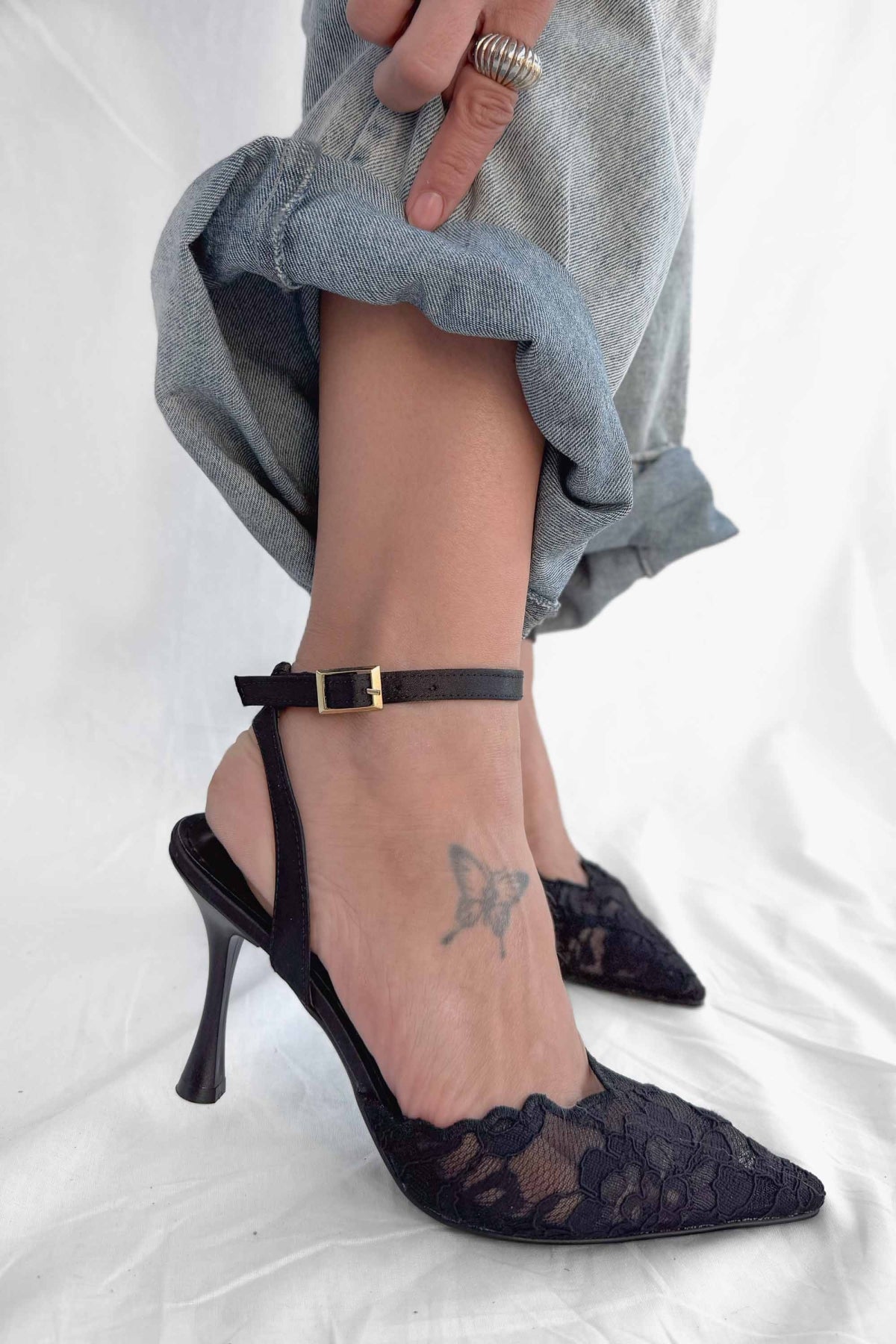 Dantella Siyah Dantel Motif Topuklu Kadın Ayakkabı