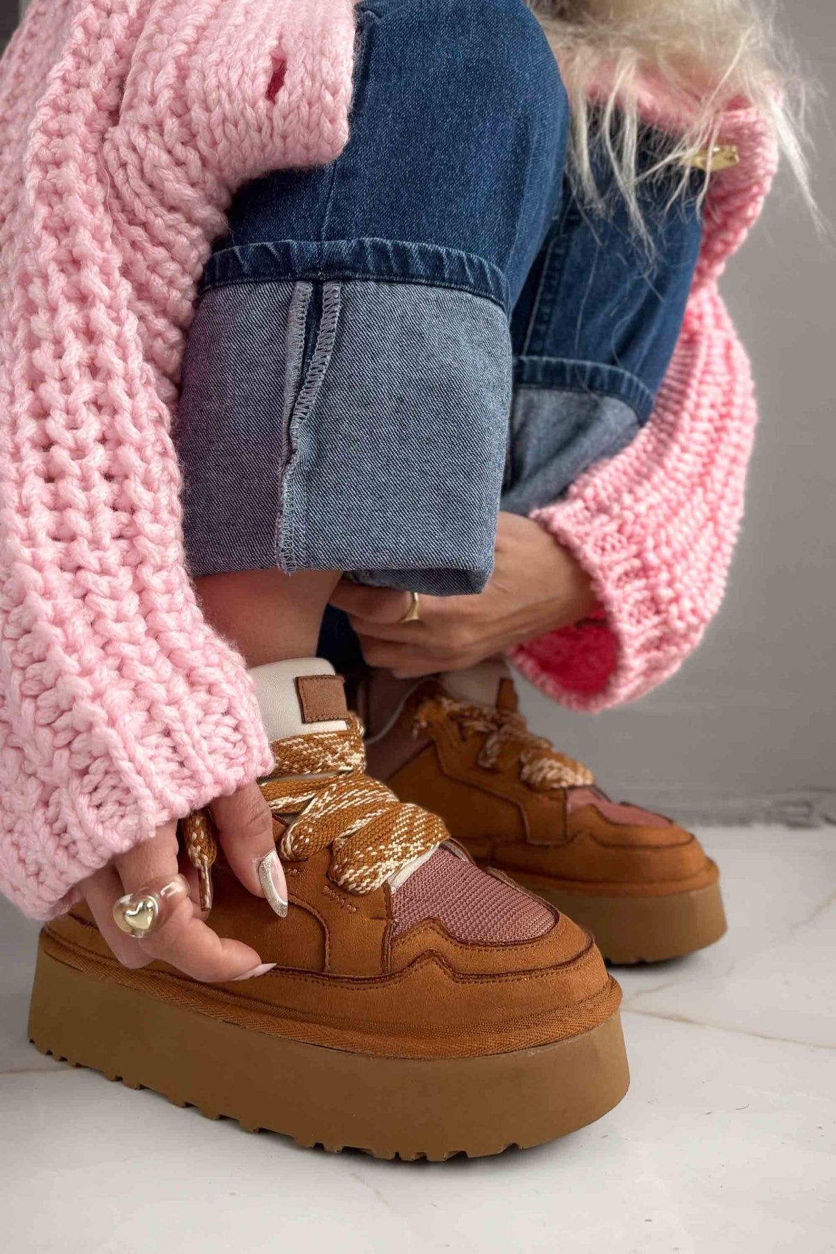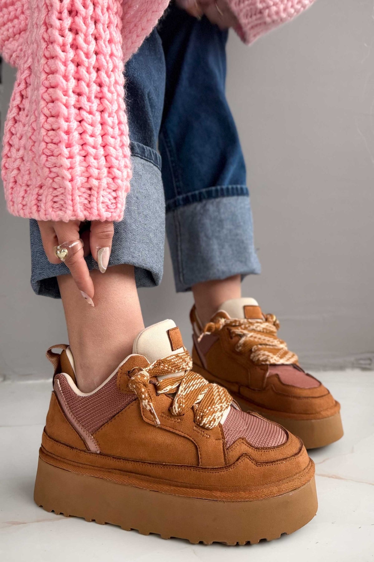 Şık tasarımı, spor ve casual stiller arasında kusursuz bir geçiş sağlar. Bağcıklı yapısı ayağı ideal şekilde kavrayarak güvenli bir kullanım sunar; kalın tabanı ise hem boy avantajı hem de yumuşak adım hissi kazandırır. Günlük şehir temposunda, uzun yürüyüşlerde ve aktif günlerde stilinden ödün vermek istemeyenler için ideal bir tercihtir.