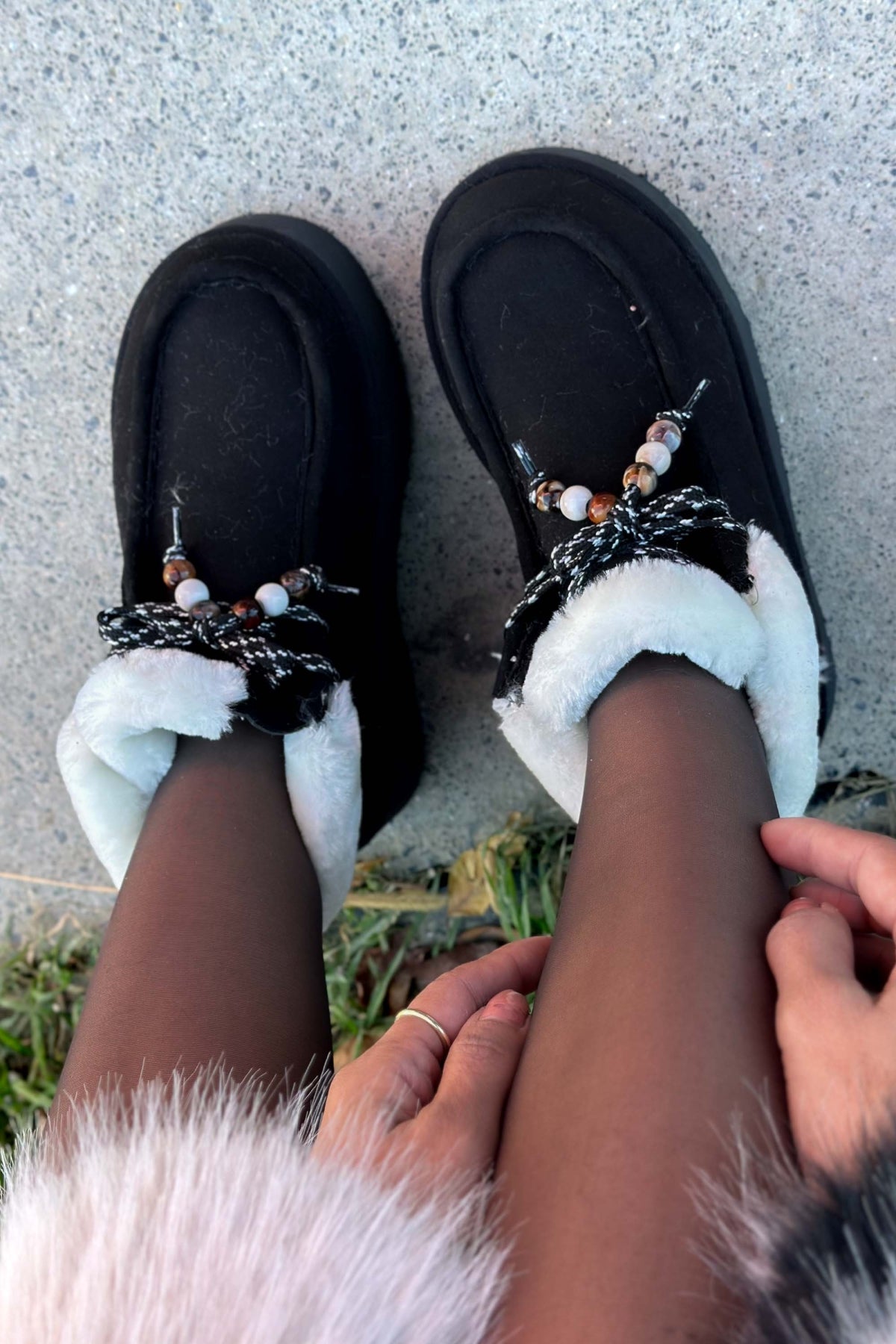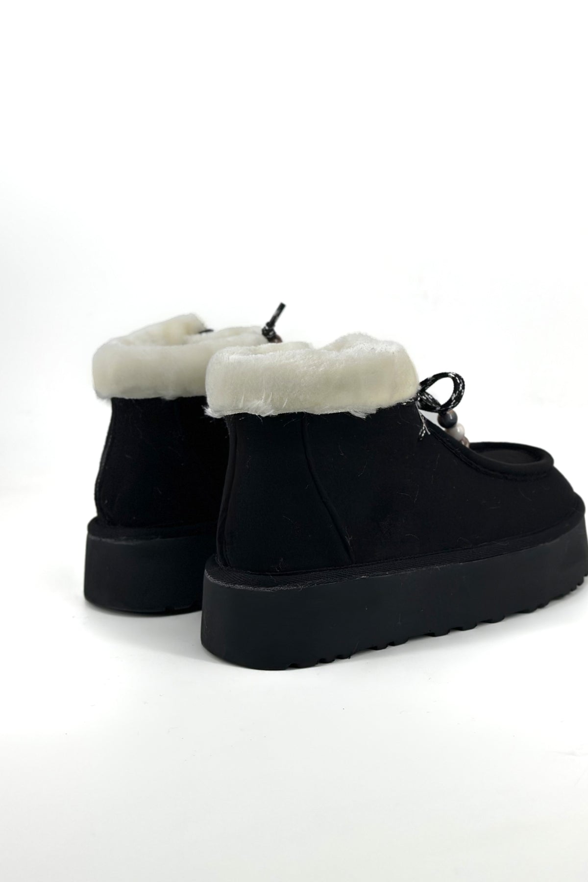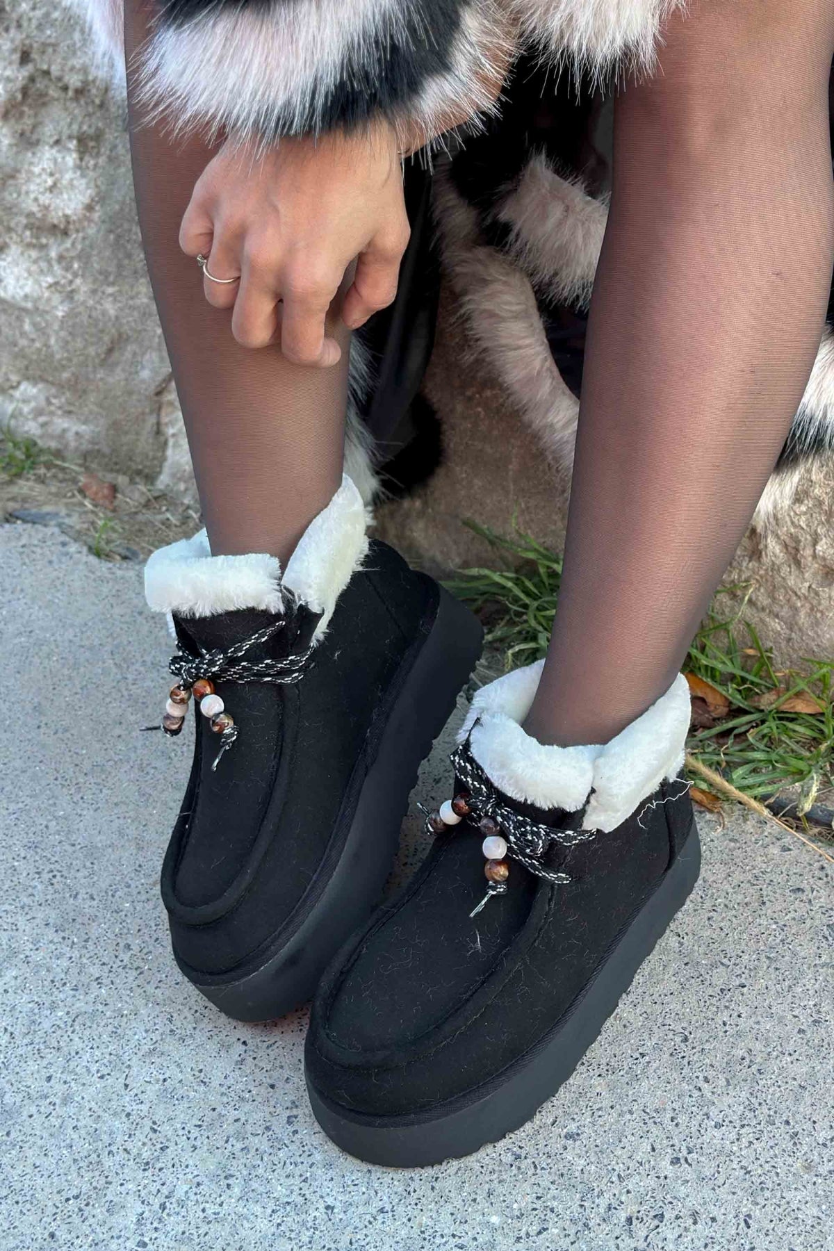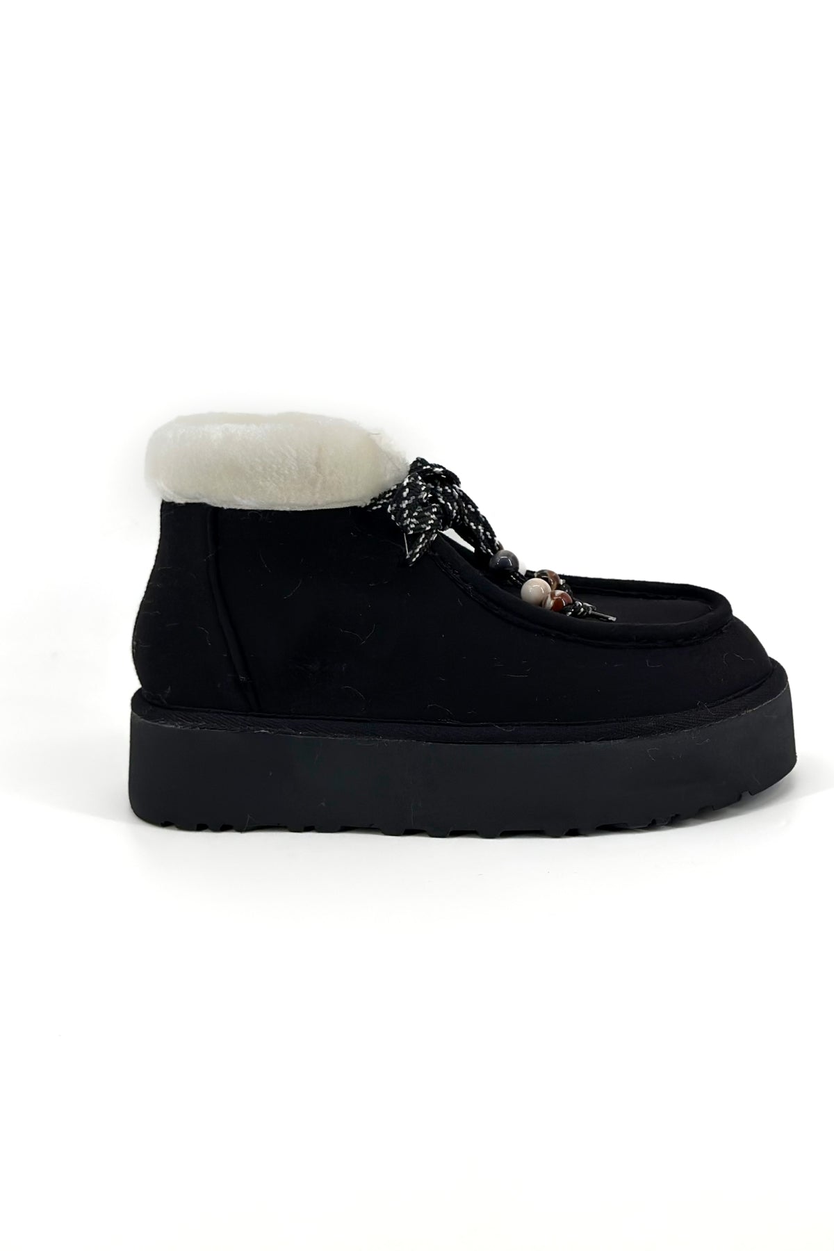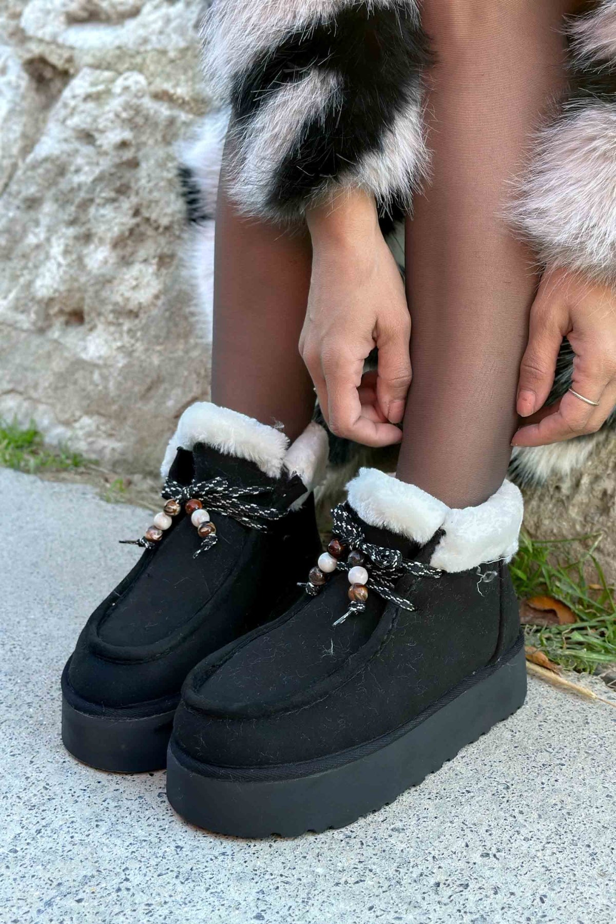 Juno Siyah Kürk Detay Boncuk Bağcıklı Kadın Bot
